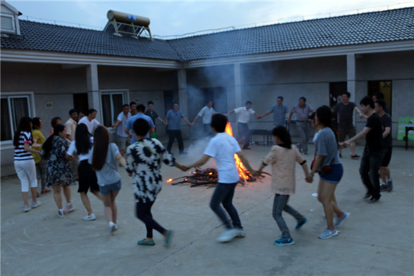 寧靜安謐的鄉間夜晚,吃完香噴噴的農家晚餐,篝火晚會在大家的期待中開始了,一群人,手拉著手圍著篝火邊跳邊唱,開心極了。一首首昔日經典“小蘋果”、“好日子”、“難忘今宵”……伴隨著歡快的舞步引爆白馬一日游活動最高潮,每一個人臉上洋溢著燦爛的笑容,大家的心也更近了。“我們是工作中的好伙伴,我們是相親相愛的華瑞人。”