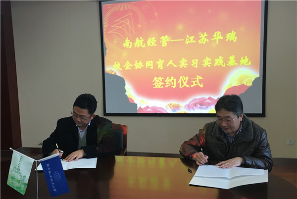 2017年12月15日上午9:30,華瑞國際集團與南京航空航天大學校企合作簽約儀式在南航經濟與管理學院舉行。南京航空航天大學經濟管理學院院長周德群、南航藝術學院院長(經管學院工商系博導)張捷、南航經濟與管理學院副院長王英、南航經濟與管理學院黨委副書記許靜、南航經濟與管理學院工商系主任王子龍、南航經濟與管理學院工商系主任謝嗣勝、南航經濟與管理學院工商系副主任劉文龍等校方領導,華瑞集團李總和集團人力資源顧總等一行參與此次簽約儀式。