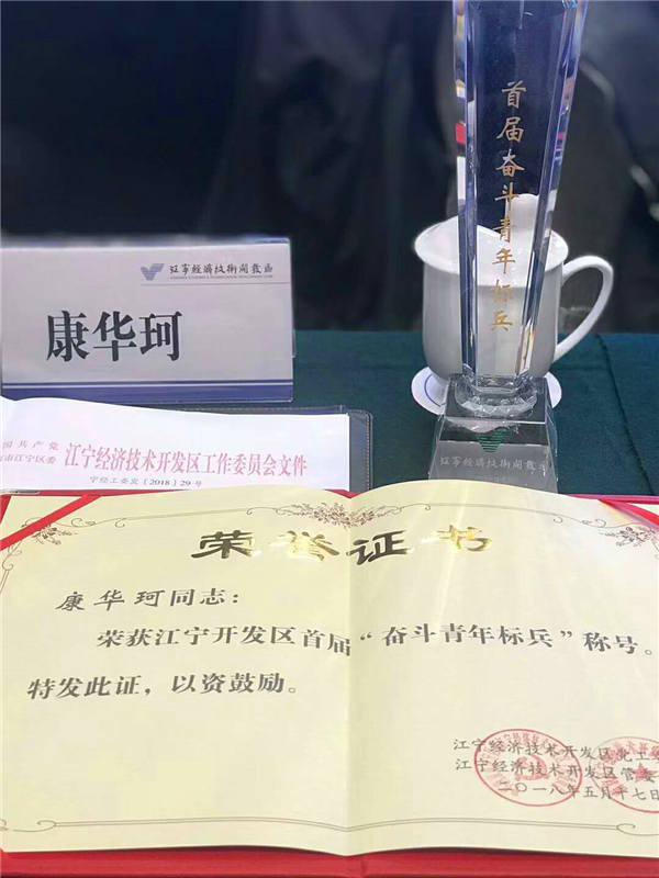 2018年5月23日上午,江寧開發區首屆“奮斗青年標兵”頒獎典禮在江寧會展中心舉辦。華瑞國際集團下屬單位江蘇屋必家商貿總經理康華珂從眾多競爭者中脫穎而出,榮獲江寧開發區首屆“奮斗青年標兵”榮譽稱號,并作為“奮斗青年標兵”代表發表了獲獎感言。