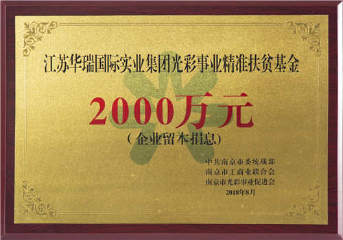 會上,市工商聯(總商會)企業家主席會長向全市非公有制經濟人士發出了積極投身鄉村振興戰略倡議書,并舉行了34家企業設立光彩事業精準扶貧留本捐息基金現場授牌儀式,基金規模共計7.5億元;向民營企業結對幫扶的44個市經濟薄弱村、20個淮安和鹽城市經濟薄弱村、東西協作對口支援地區陜西商洛與新疆伊寧地區貧困家庭學生代表進行了現場捐贈,共計350萬元;向六合區竹鎮鎮八里社區等5個市經濟薄弱村的光彩事業精準扶貧項目進行了資金捐贈,共計360萬元。其中,華瑞公益性出資2000萬元,用于南京市光彩事業精準扶貧基金,為振興鄉村貢獻自己的一份力量。