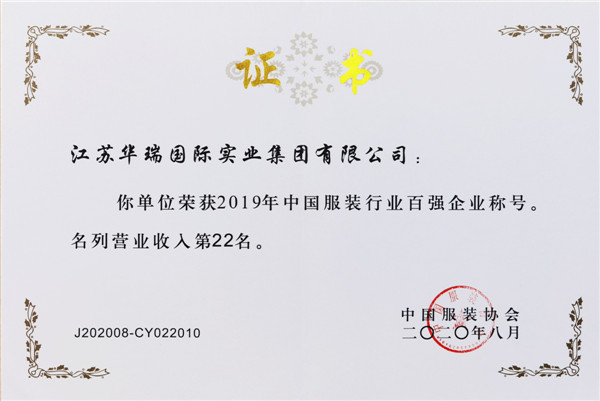 根據全國各省、自治區、直轄市服裝行業協(商)會 等單位初審和推薦,中國服裝協會對2019年中國服裝 行業企業申報的“營業收入”、“利潤總額”和“營業收入 利潤率”資料進行審核,評選出了2019年服裝行業百強 企業。華瑞國際集團榮獲營業收入百強第22名、利潤 總額百強第50名,可喜可賀!華瑞全體同仁將繼續努 力,再創輝煌!