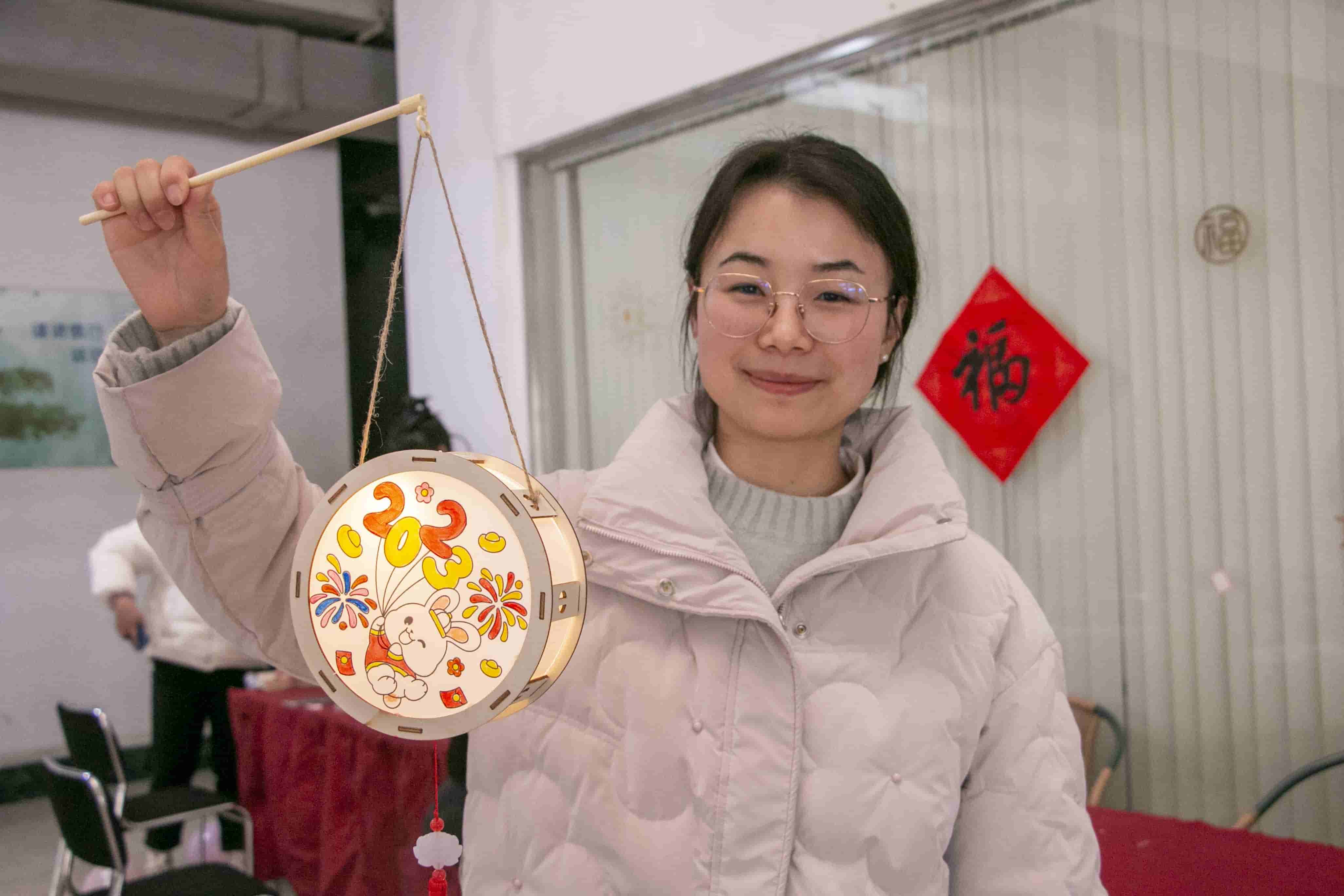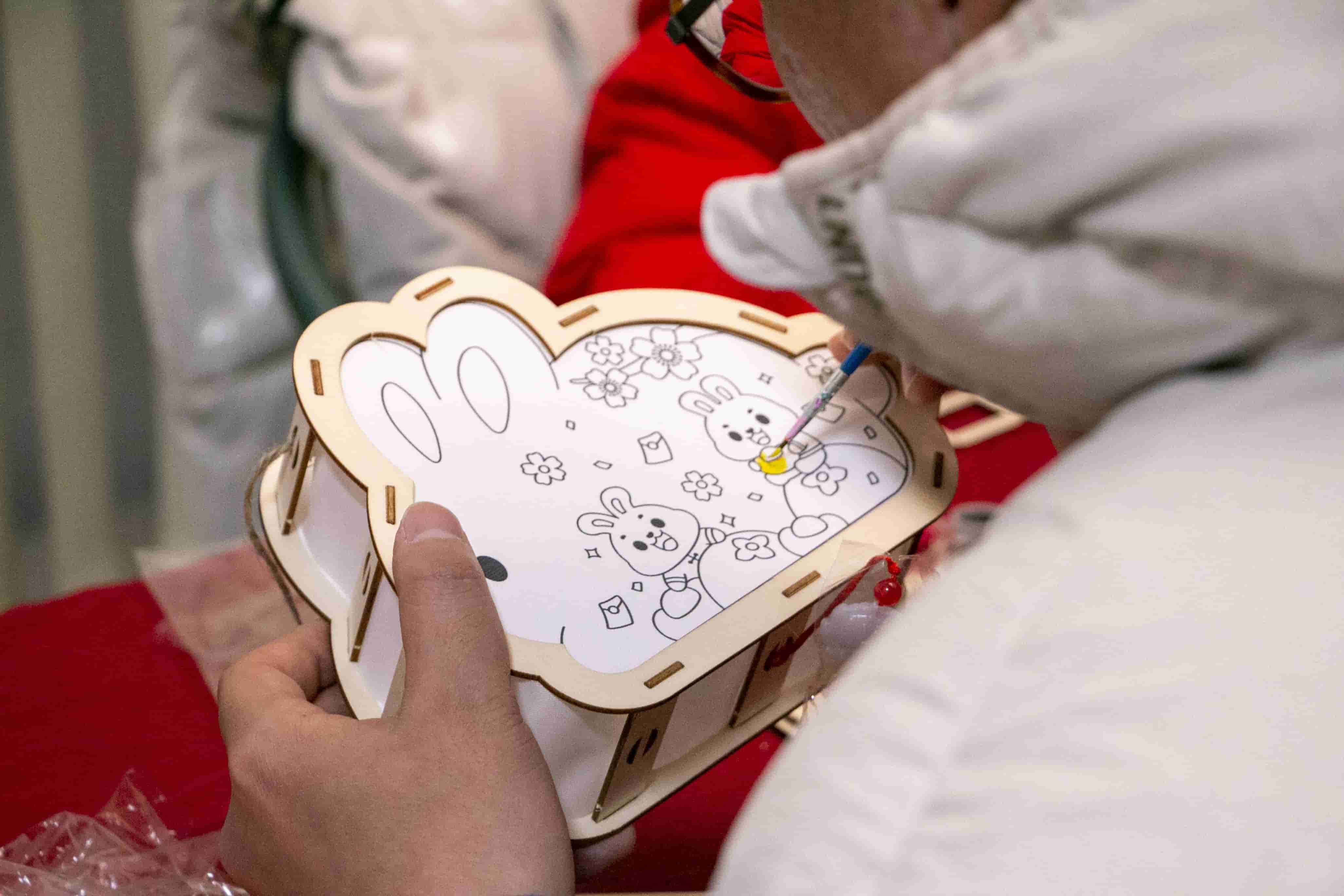 最后我們?cè)賹㈢R頭轉(zhuǎn)向元宵花燈DIY現(xiàn)場(chǎng),大家都沉浸在剪裁、組裝、粘貼、繪圖的樂(lè)趣中,細(xì)致地制作花燈的每一個(gè)環(huán)節(jié),相互探討調(diào)色、組裝步驟,彼此分享花燈圖案,還有小朋友參與其中,發(fā)揮著天馬行空的想象力,大膽使用絢麗色彩,別有一番趣味。在一雙雙巧手的默契配合下,一個(gè)個(gè)可愛(ài)喜慶、別樣精致的花燈已初見(jiàn)雛形,燈光映照在色彩斑斕的畫(huà)布上,姿態(tài)各異的兔子栩栩如生。